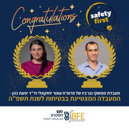 התזמון המושלם לבשורה נהדרת – זה בטוח! בדיוק ביום הבטיחות הפקולטי התבשרנו, שהמעבדה לממשקי ננו־ביו של פרופ'ח עומר יחזקאלי וד"ר יפעת כהן, נבחרה למעבדה הטכניונית המצטיינת בבטיחות לשנת תשפ"ה! ועדת הפרס התרשמה מהמודעות הבטיחותית הגבוהה שמתקיימת במעבדה, לצד אחריות ושיתוף פעולה מלא עם יחידת הבטיחות, במטרה לחתור לתהליך מתמיד של למידה ויישום. בנוסף להדגשת רמת היוזמה והאחריות הייחודית