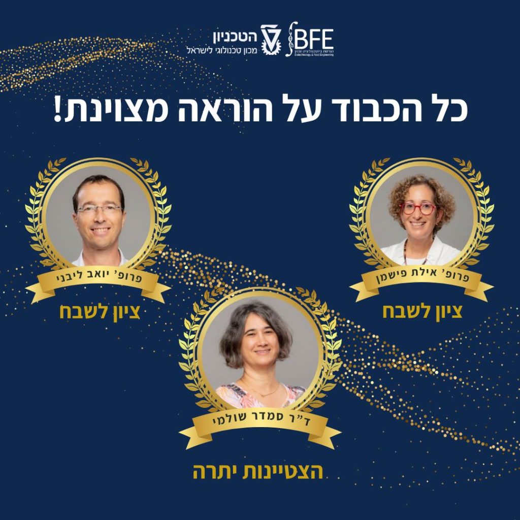 כולנו בפקולטה התמלאנו בגאווה ענקית בזכות שלוש זכיות על הצטיינות בהוראה בסמסטר אביב תשפ"ה: ד"ר סמדר שולמי זכתה בהצטיינות יתרה בהוראה, על הוראת הקורס 'מעבדה בריאקטורים ביולוגיים'. זאת הפעם השנייה שד"ר שולמי זוכה בקורס זה. בנוסף, פרופ' אילת פישמן ופרופ' יואב ליבני זכו בהצטיינות לשבח על הוראת הקורסים 'כימיה של מזון' ו־'מדע וטכנולוגיה של ביו־חומרים', בהתאמה. סמדר, אילת ויואב – כל הכבוד ויישר כוח על הזכיות המרשימות! בזכותכן ובזכותך הפקולטה שלנו ממשיכה להיות כוח מוביל בתחום ההוראה בטכניון.